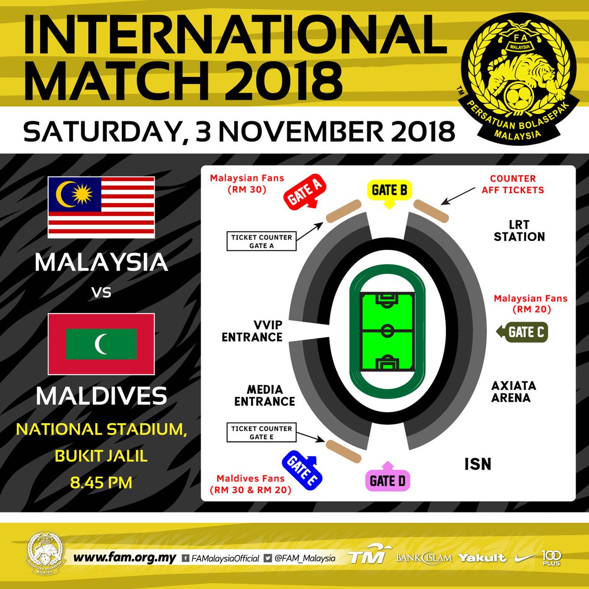 *PNTU MASUK KE STADIUM AKNA DIBUKA JAM 6 : 30 PETANG IAITU PENYOKONG MALAYSIA DIMINTA UNTUK MASUK 5 LALUAN DI PINTU A (TIKET RM30) DAN 20 LALUAN DI PINTU C (ITKET RM20) MANAKALA PENYOKONG MALDIVES MASUK MENERUSI LALUAN DI PINTU E (TIKET RM30 & RM 20).