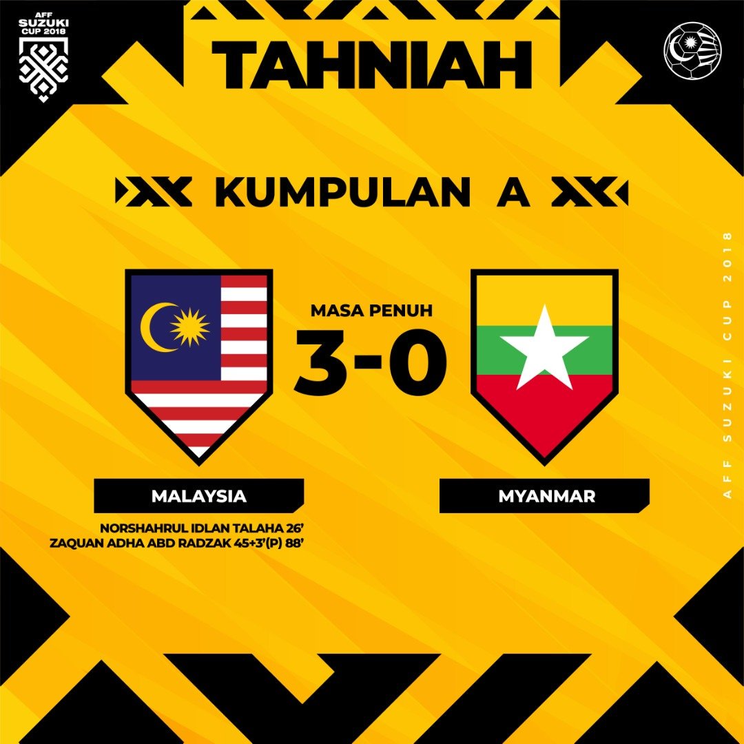 Jaringan pembukaan daripada Norshahrul Idlan Talaha dan dua jaringan daripada Zaquan Adha membawa Malaysia ke Separuh Akhir #AFFSuzukiCup18 selaku naib juara Kumpulan A selepas menewaskan Myanmar 3-0.