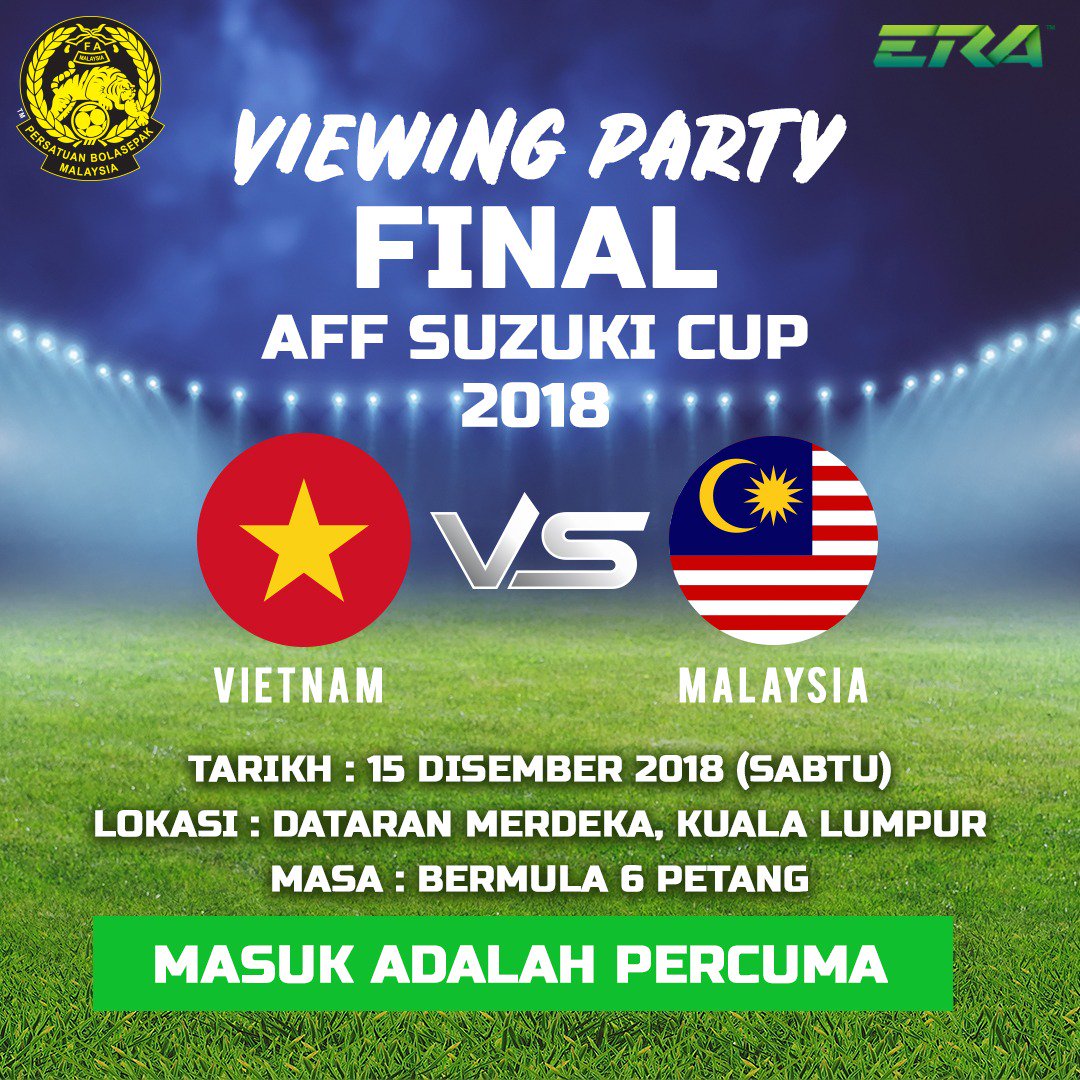 Korang memang nak kitorang buat Viewing Party kan ? Jadi, jom lah ramai-ramai esok malam kita berkumpul kat Dataran Merdeka untuk saksikan final AFF Suzuki Cup 2018 antara Vietnam vs Malaysia. MASUK PERCUMA ! #AFFSuzukiCup2018