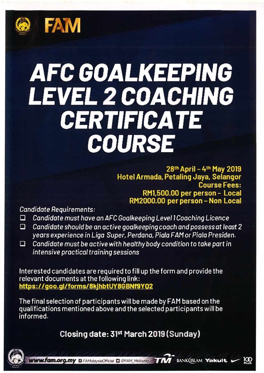 Persatuan Bolasepak Malaysia (FAM) akan menganjurkan dan mengendalikan Kursus Kejurulatihan Sijil Tahap 2 Penjaga Gol AFC dari 28 April hingga 4 Mac 2019.